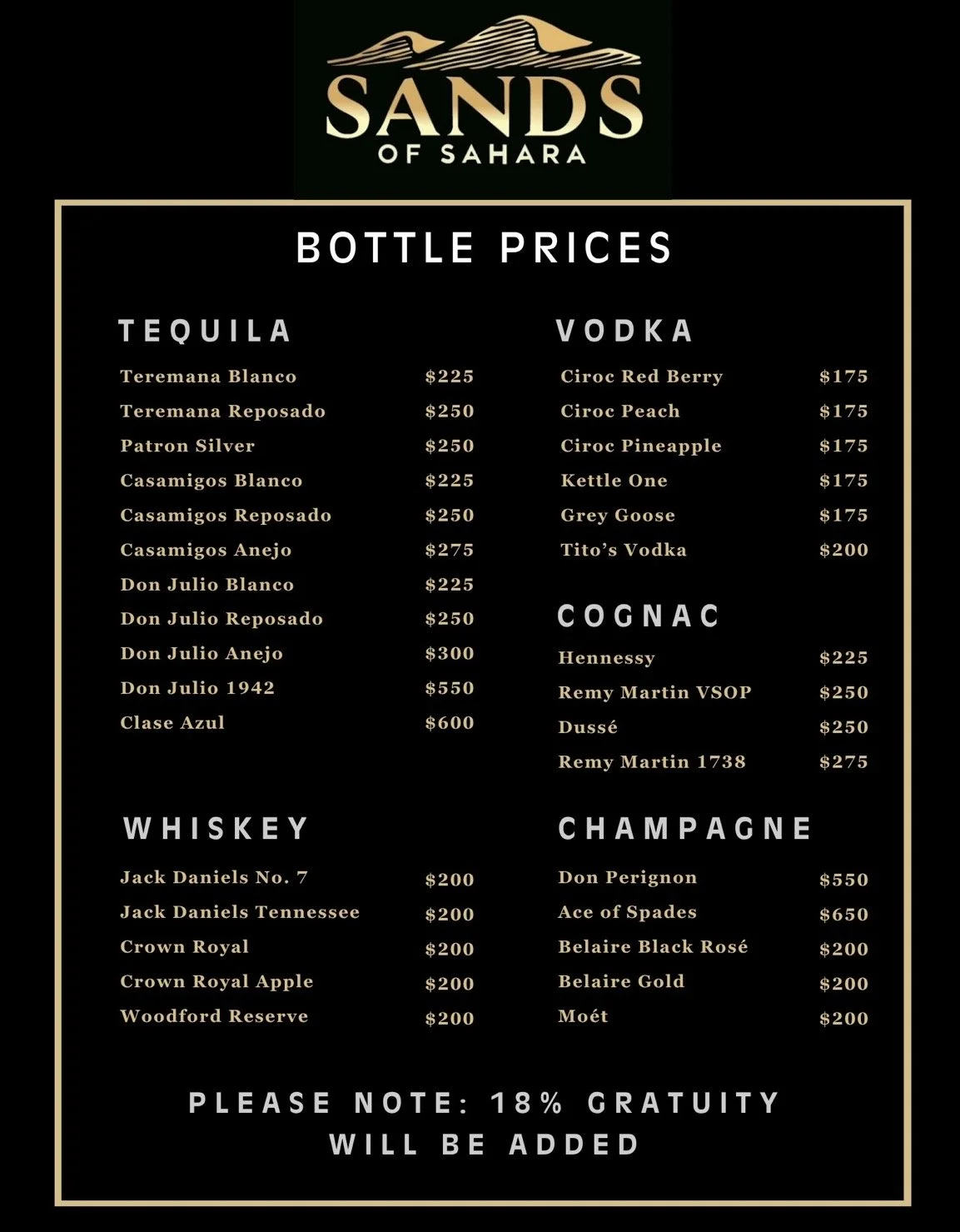 To ensure exceptional service and a seamless experience, a 12% gratuity is automatically added to all checks. This allows us to properly reward our dedicated staff who help create the elevated atmosphere you've come to expect. We appreciate your support and look forward to serving you.